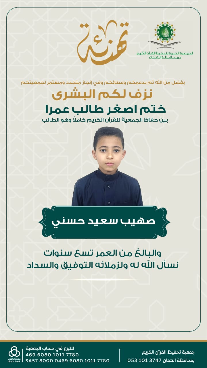 تتقدم إدارة جمعية تحفيظ القرآن الكريم بالشنان